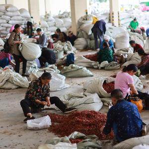 6月6日,工人在貴州省遵義市中國辣椒城進行辣椒脫把。