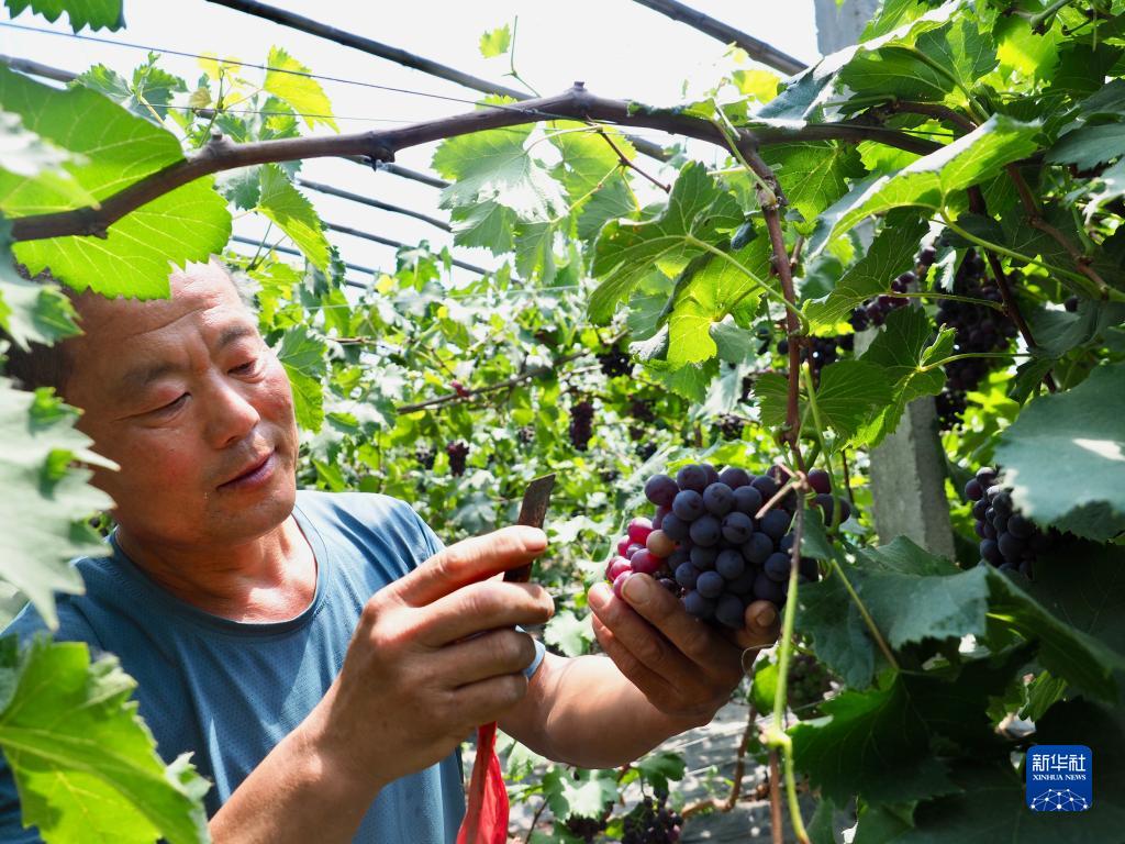 6月6日,在楊柳雪鎮西辛莊村的果蔬大棚內,種植戶在查看葡萄長勢。
