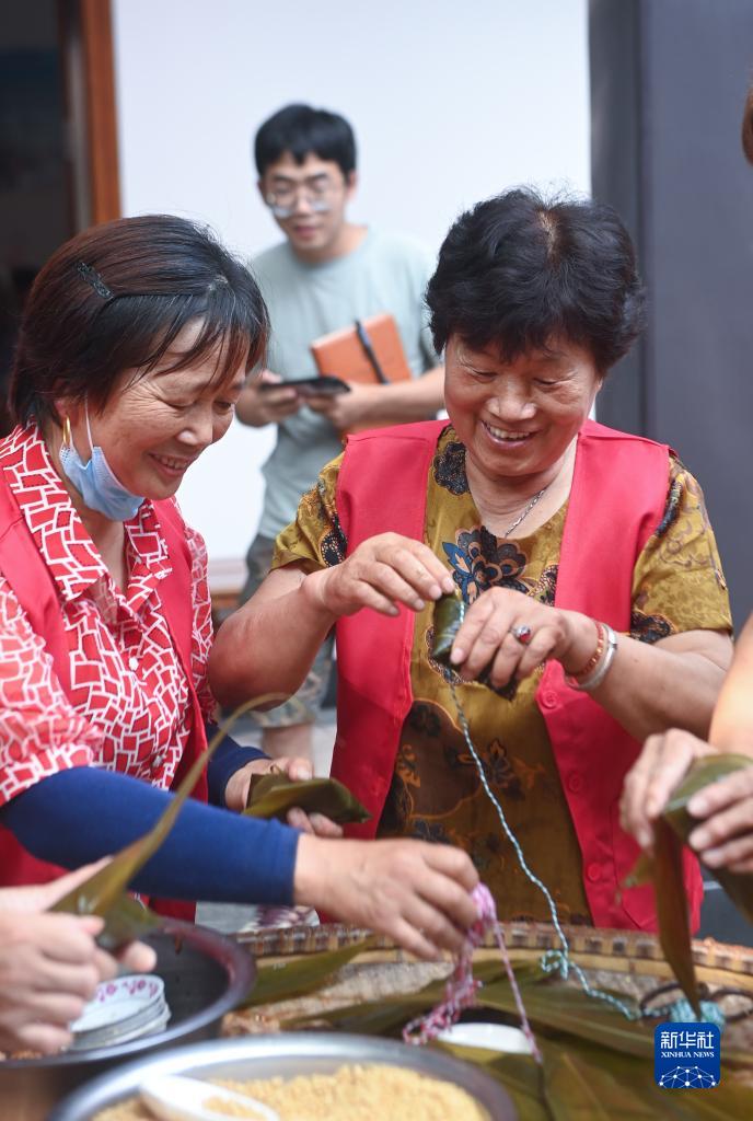 6月7日,在安華鎮球山村的愛心食堂里,志愿者在包粽子。