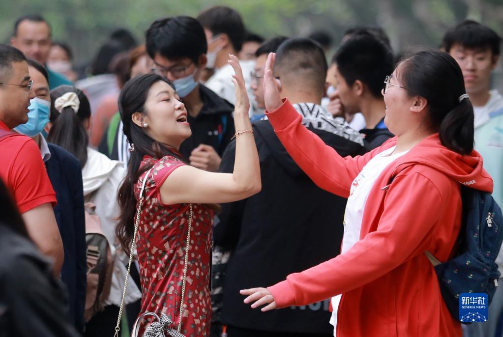 6月7日,在江蘇省揚州中學考點,考生與送考老師擊掌鼓勁。