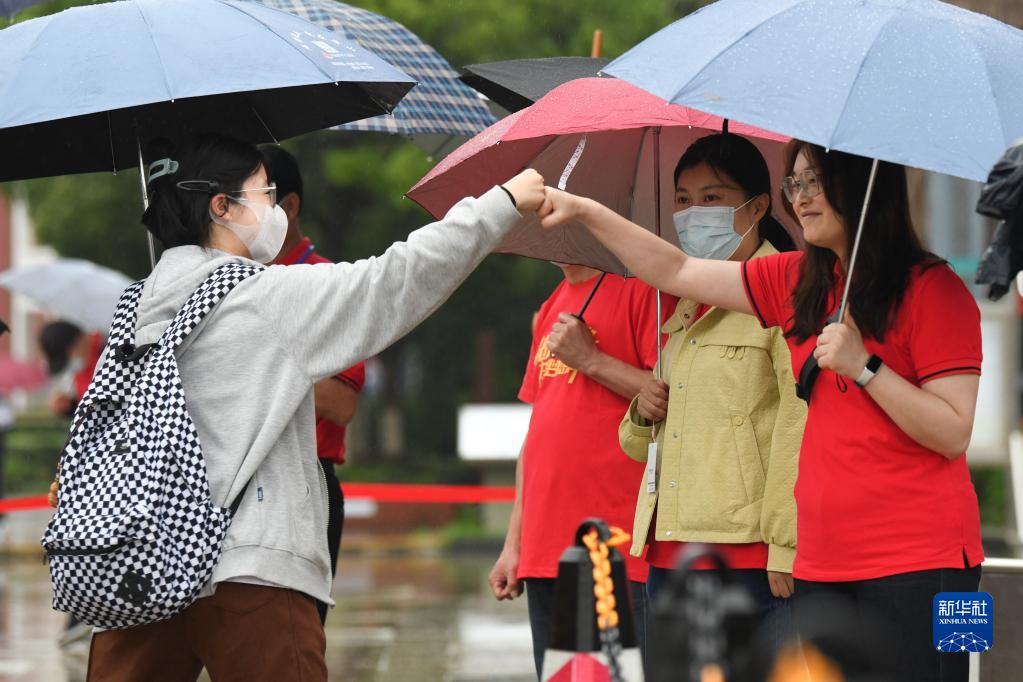 6月7日,在浙江省舟山中學考點外,送考老師與考生碰拳。