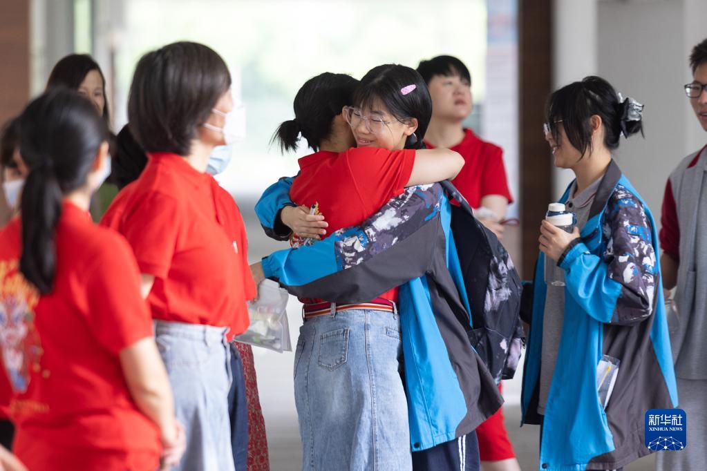 6月7日,在浙江省湖州市濱湖高級中學考點,老師與考生相擁祝福。