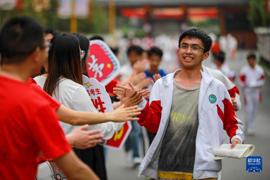6月7日,考生在貴州省畢節市民族中學考點和送考老師擊掌。