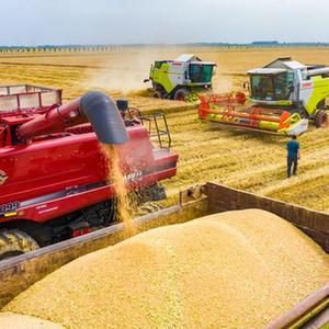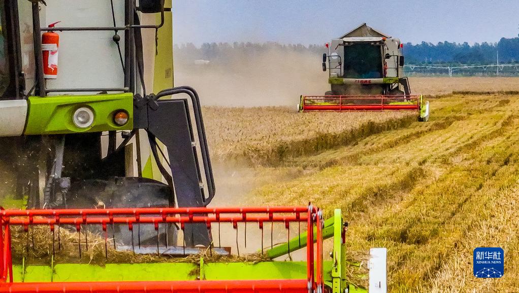 “三夏”時節,在河南省駐馬店市西平縣老王坡高標準農田,農機手操作大型收割機收割小麥,田間地頭一派忙碌景象。
