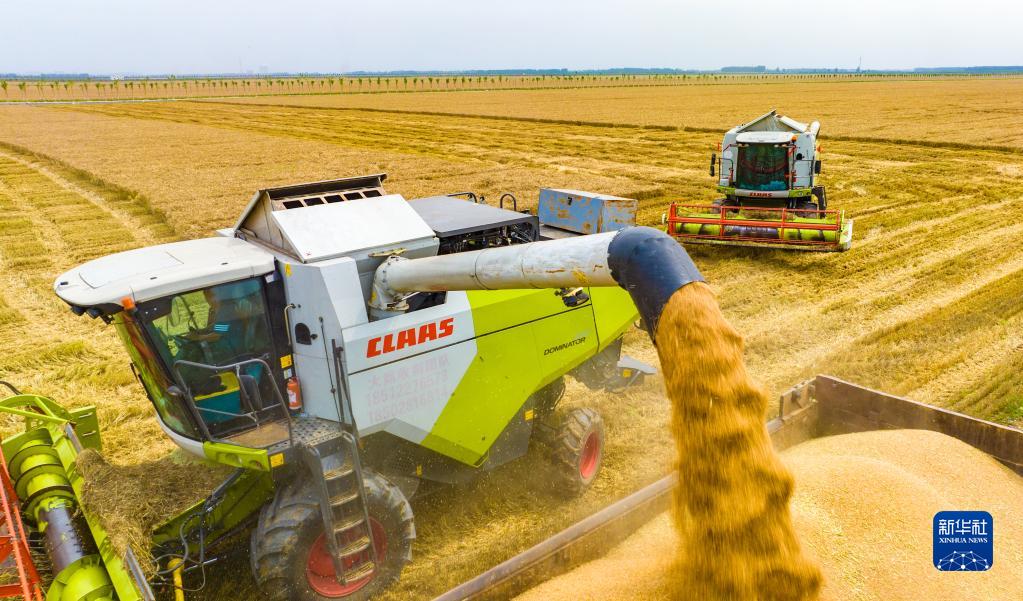 “三夏”時節,在河南省駐馬店市西平縣老王坡高標準農田,農機手操作大型收割機收割小麥,田間地頭一派忙碌景象。
