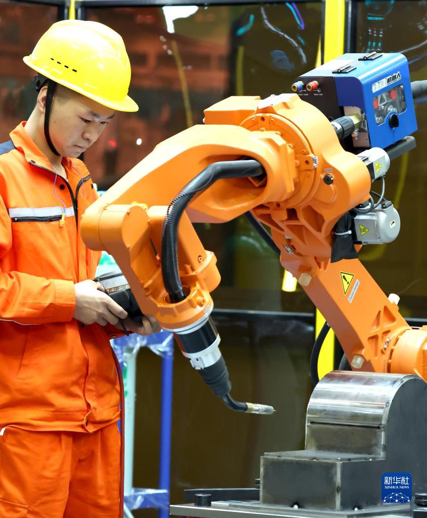 6月7日,參賽選手在焊接設備操作工—機器人項目的比賽中。