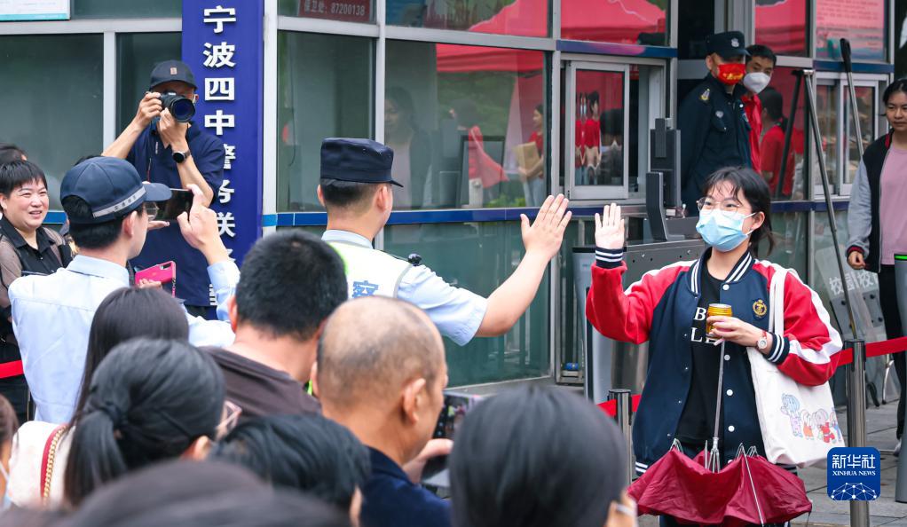 6月7日,在寧波四中考點,走出考場的考生與考場門口維持秩序的警察擊掌。