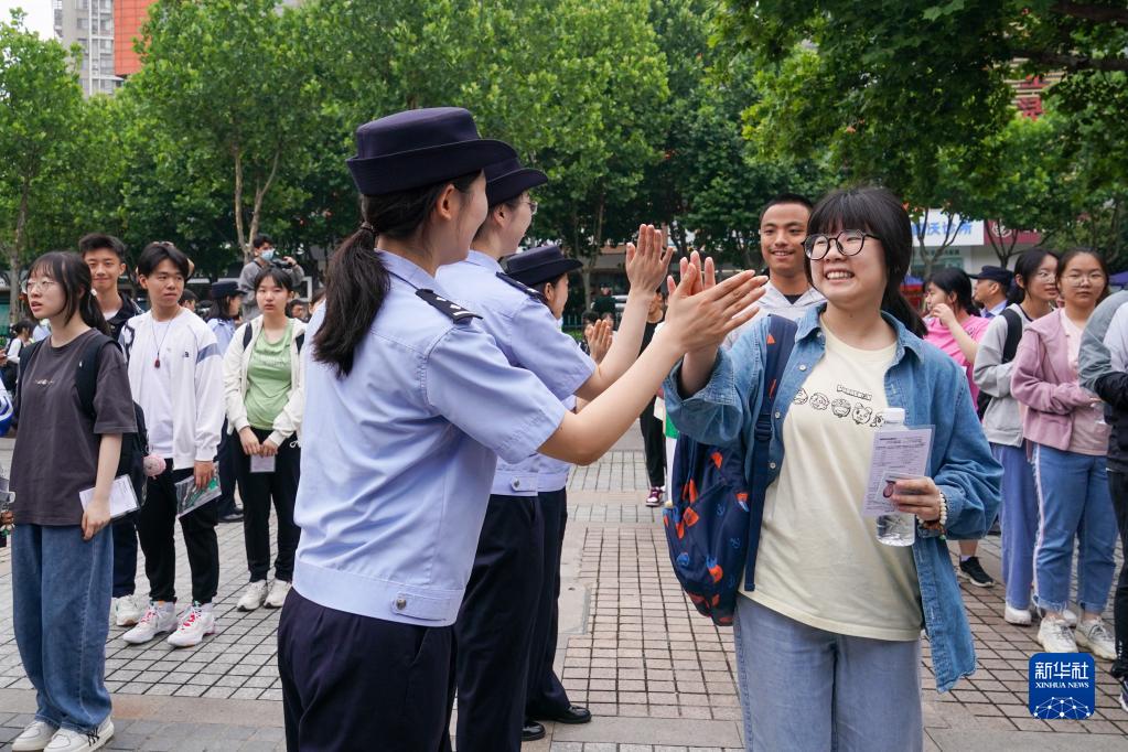 6月7日,在南京中華中學考點,準備進入考場的考生與執勤民警擊掌。