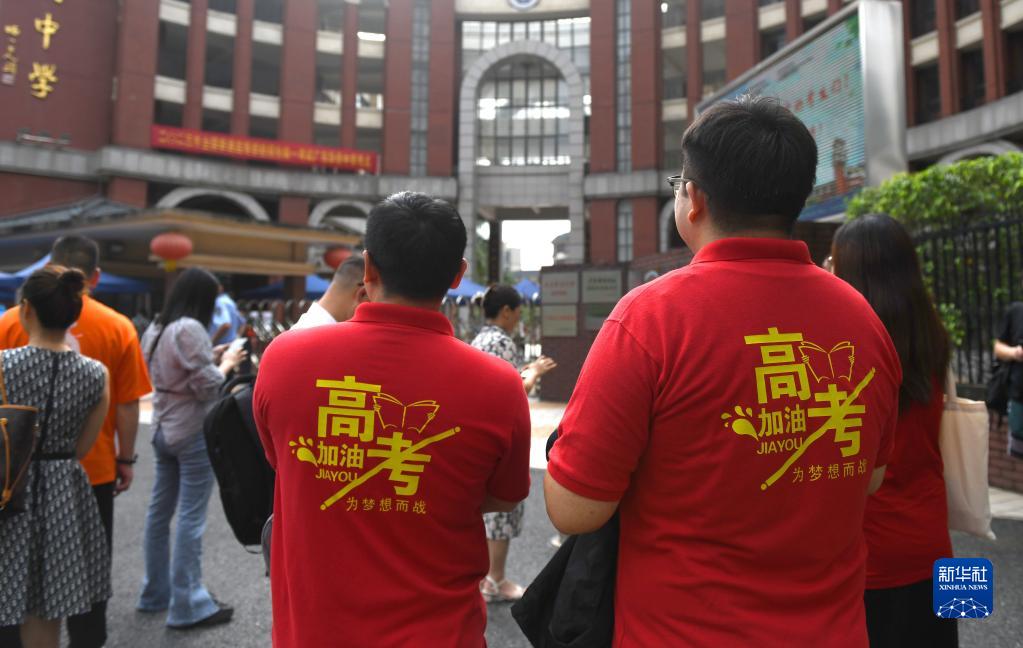 6月7日,在廣東華僑中學考點,送考老師為學生加油打氣。