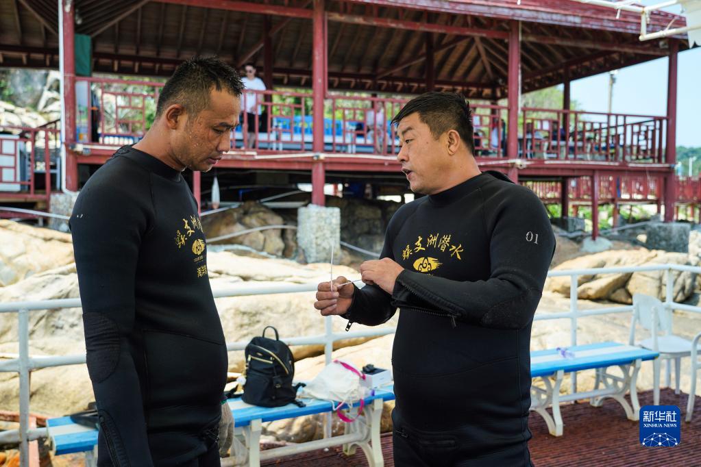 王豐國(右)在傳授珊瑚移植作業中扎帶的捆綁經驗(5月17日攝)。
