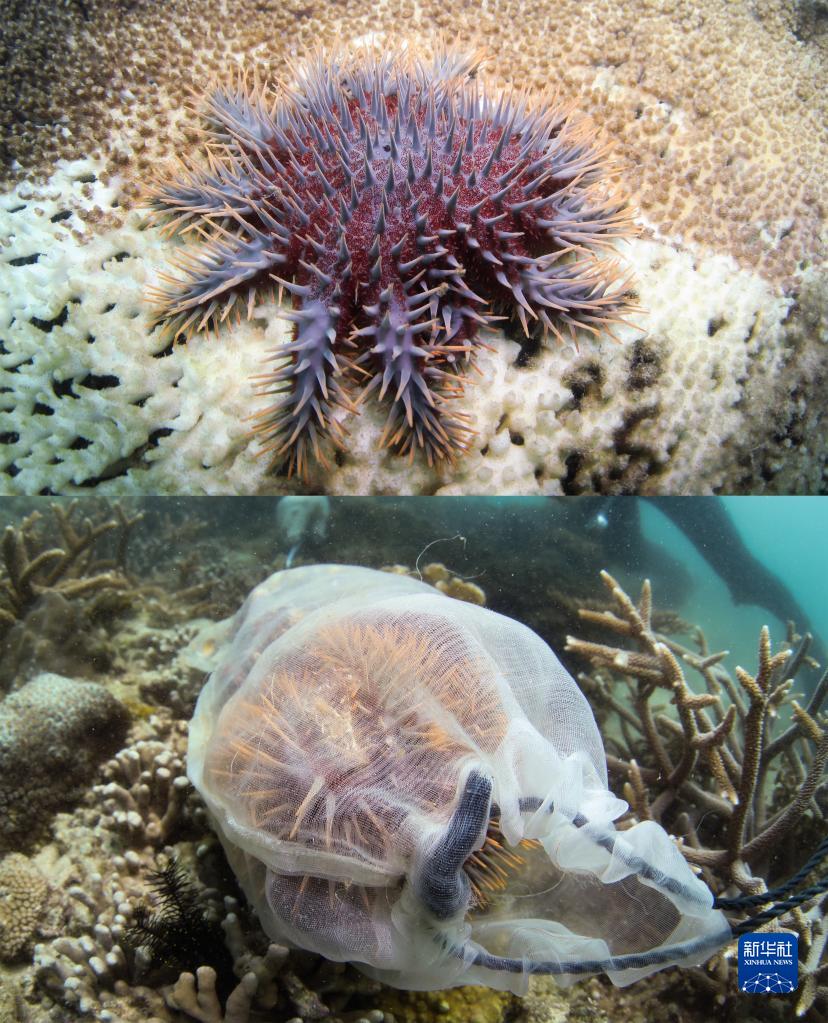這是一張拼版照片:上圖為在蜈支洲島海域海洋牧場發現的長棘海星(5月17日攝);下圖為蜈支洲島旅游區海洋部員工將長棘海星“打包”準備帶上陸地處理(5月17日攝)。