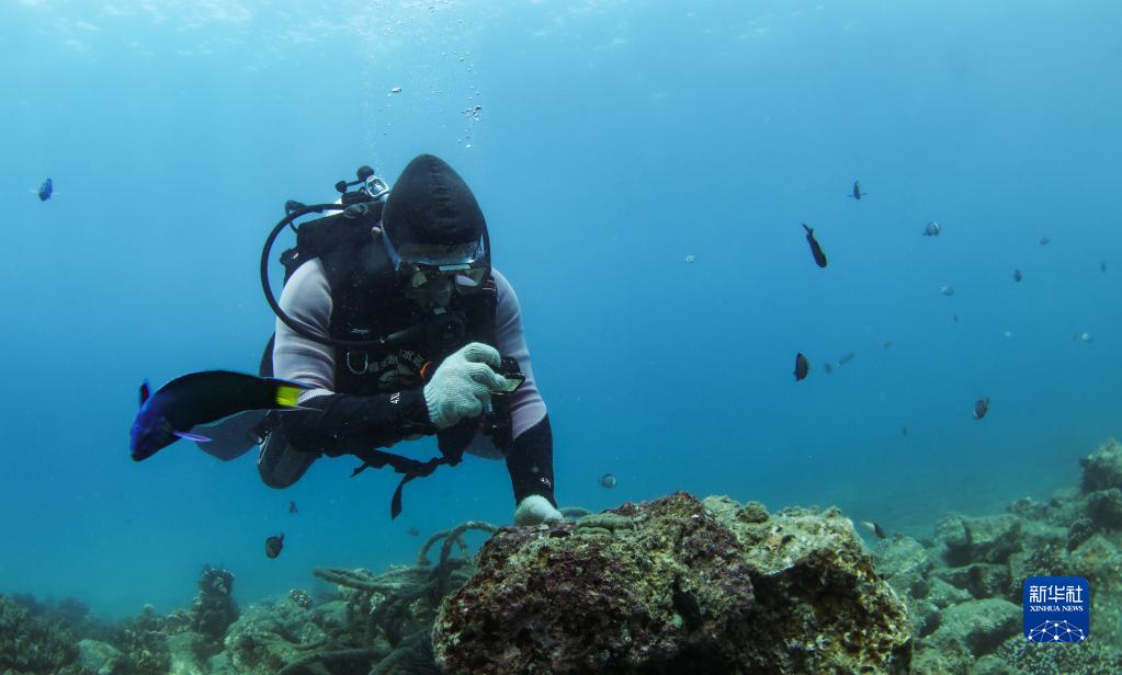 在蜈支洲島海域海洋牧場,王豐國在水下開展巡護工作(2020年3月28日攝)。