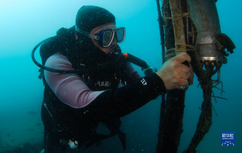在蜈支洲島海域海洋牧場,王豐國在水下作業(2020年1月12日攝)。