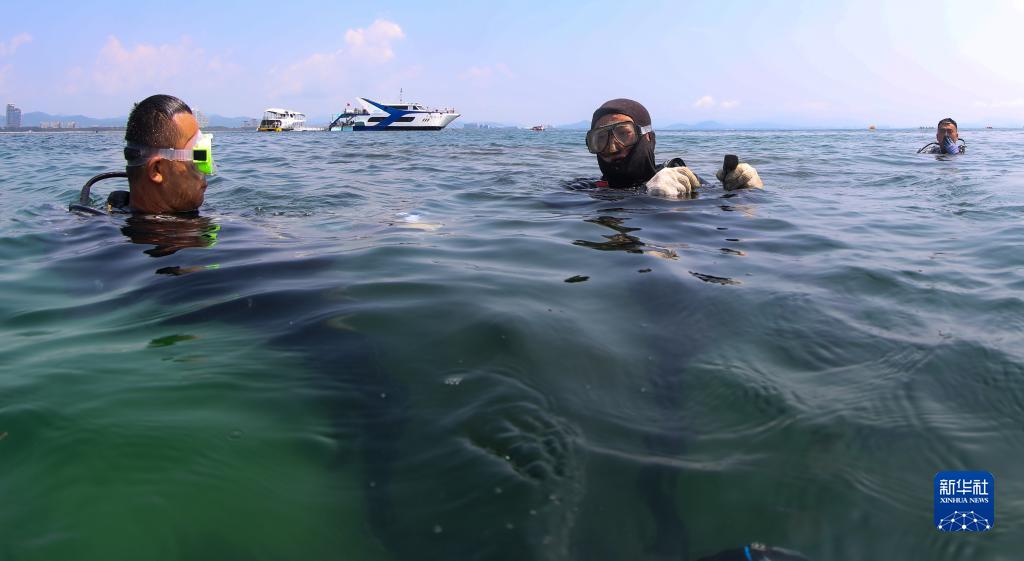 在蜈支洲島海域海洋牧場,王豐國(中)出水后與同事溝通(5月17日攝)。