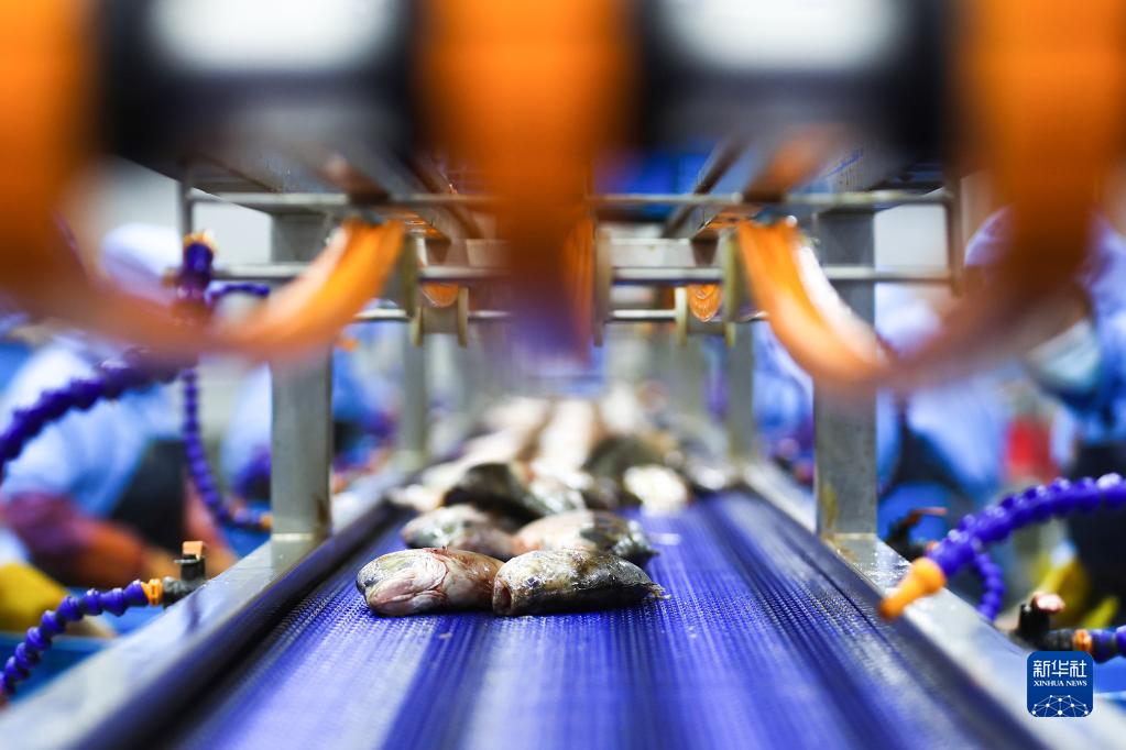 這是6月7日在安徽省黃山市一家食品供應鏈公司內拍攝的臭鱖魚加工制作生產線。