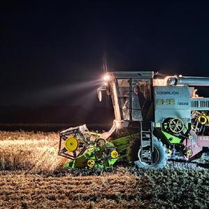 6月6日晚,在山東省菏澤市曹縣的一處麥田,農機手駕駛收割機收割小麥。