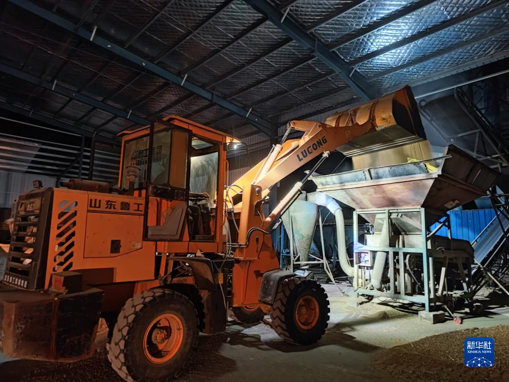 6月6日晚,在山東省菏澤市曹縣王集鎮小麥烘干加工合作社內,鏟車將濕麥倒入烘干機入料口 。