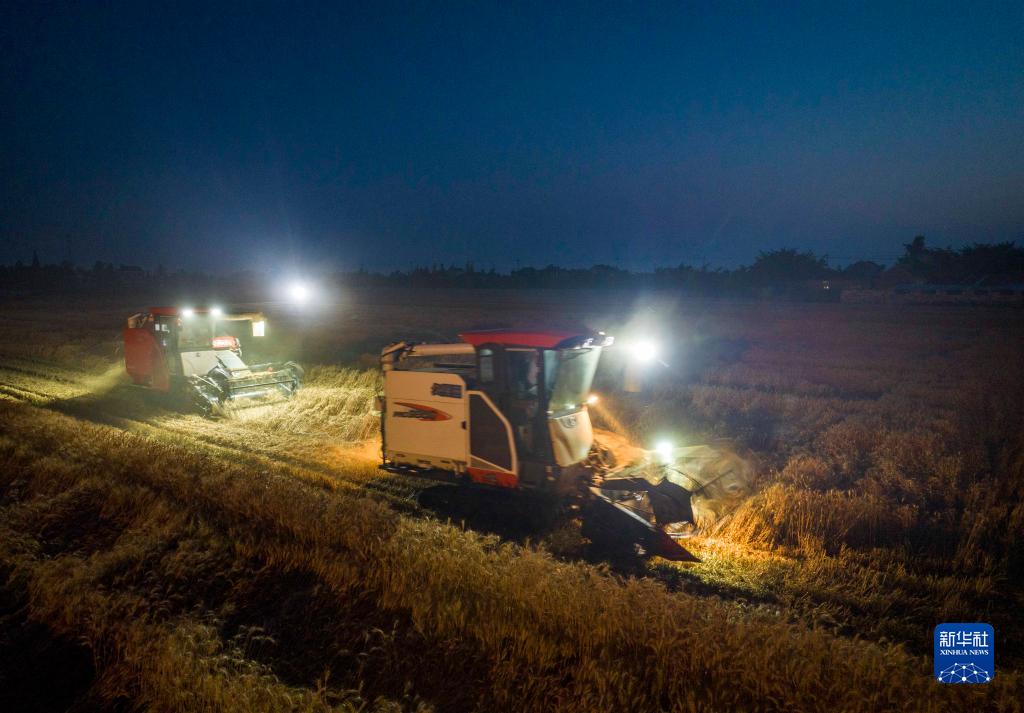 6月6日晚,村民駕駛農機在泰州市姜堰區顧高鎮翟莊村搶收小麥(無人機照片)。