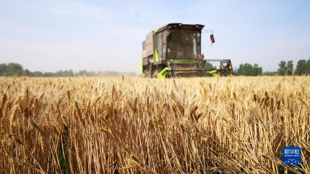 6月7日,收割機在山東省臨沂市郯城縣郯城街道田間收割小麥。