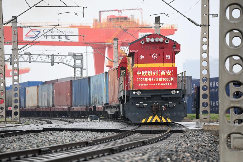 3月23日,X8489次中歐班列從西安國際港站駛出開往俄羅斯謝利亞季諾。新華社記者 李一博 攝