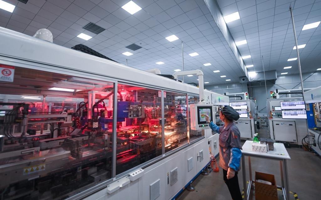 4月11日,在位于浙江省湖州市吳興區織里鎮的浙江貝盛綠能科技有限公司的車間內,自動化流水線在加緊生產出口歐洲的光伏組件。新華社記者 徐昱 攝