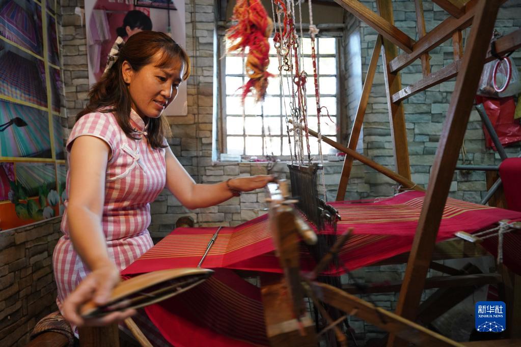 6月7日,河北省沙河市王硇村村民在家里織布。