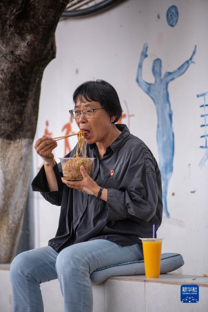6月7日,張桂梅在考場外吃午飯。