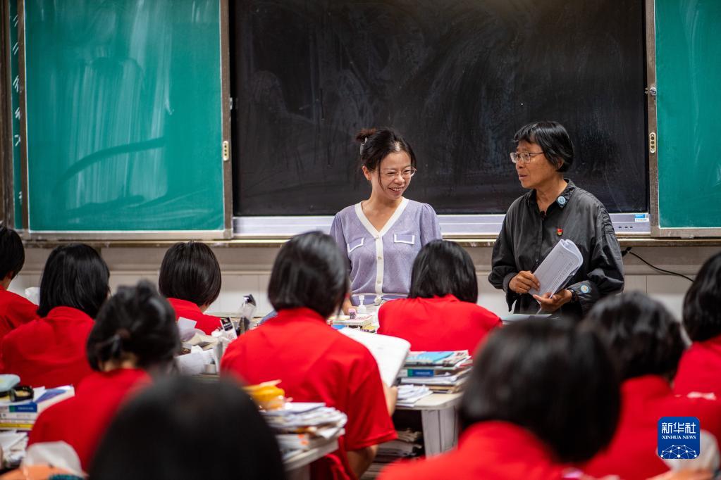 張桂梅(右)與畢業班的老師交流情況(6月6日攝)。