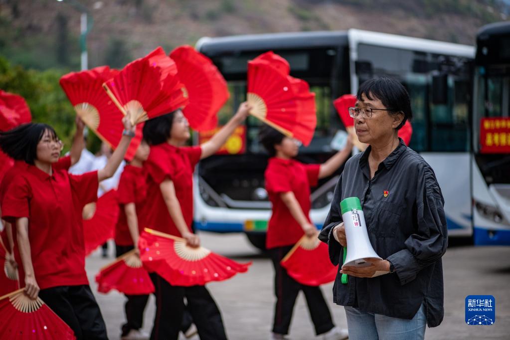 6月7日,張桂梅帶著低年級學生給準備出發參加高考的同學們加油鼓勁。