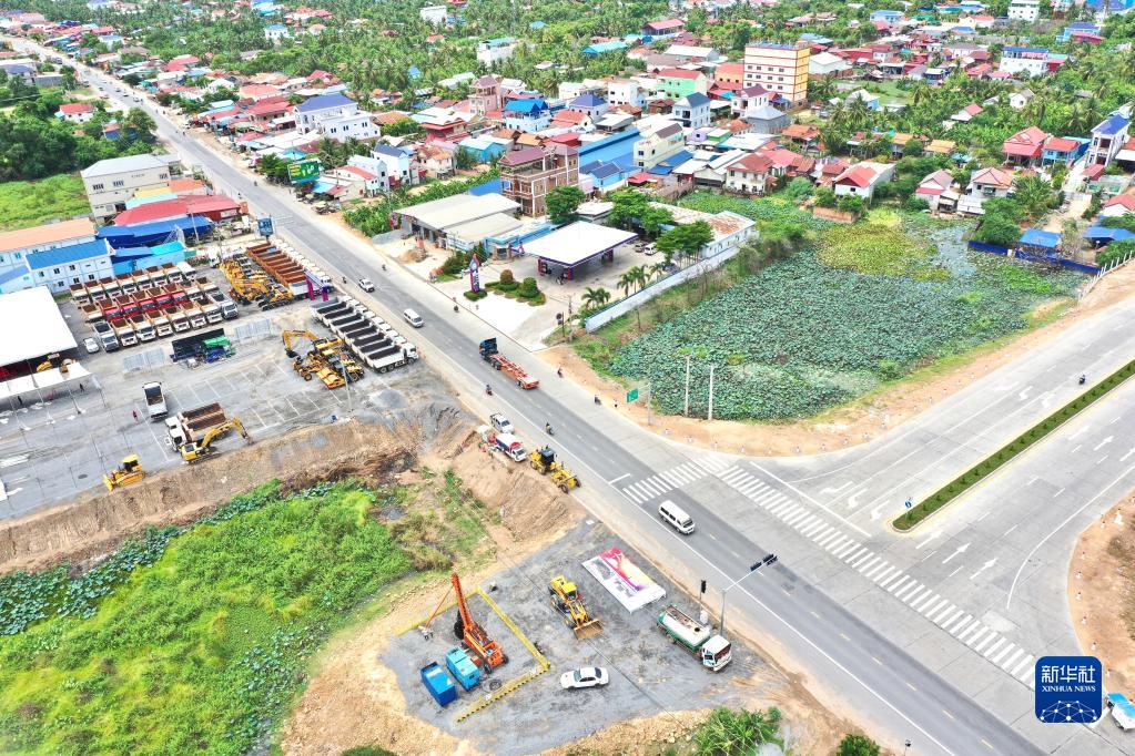 這是6月5日在柬埔寨干丹省拍攝的高速公路施工起點(無人機照片)。