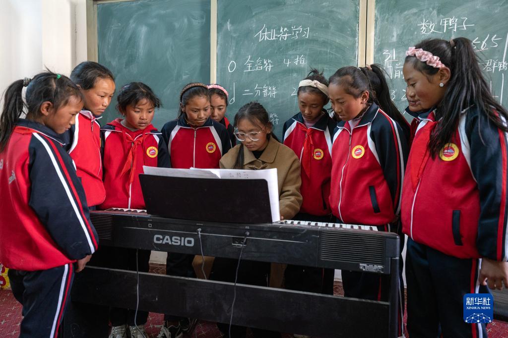 6月5日,鋼琴課老師巴桑(中)在教旦增吉宗(前右二)和其他同學樂曲《我的家在日喀則》。新華社記者 費茂華 攝