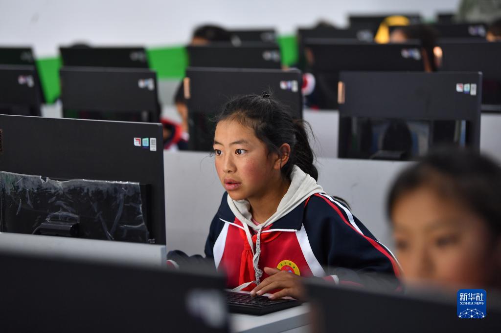扎西宗鄉完全小學的學生在上計算機課(6月5日攝)。新華社記者 晉美多吉 攝