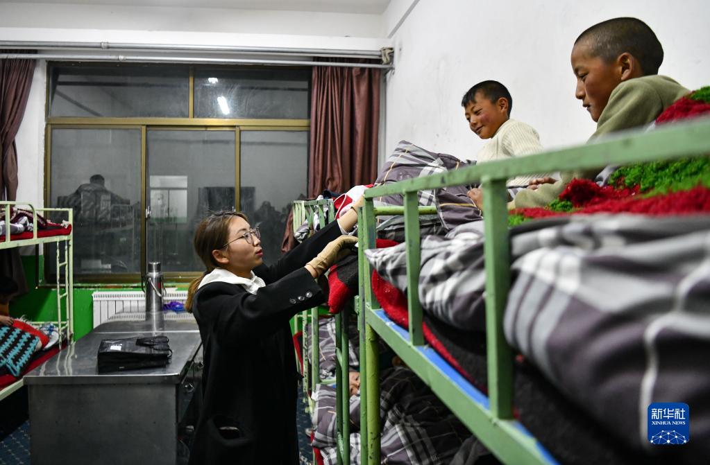 扎西宗鄉完全小學的值班老師在檢查孩子睡覺時是否蓋好被子(6月5日攝)。新華社記者 晉美多吉 攝