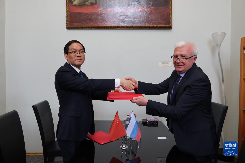 6月7日,在俄羅斯首都莫斯科,上海市歷史博物館館長周群華(左)與俄羅斯國家歷史博物館館長列維金簽訂友好合作備忘錄。新華社發