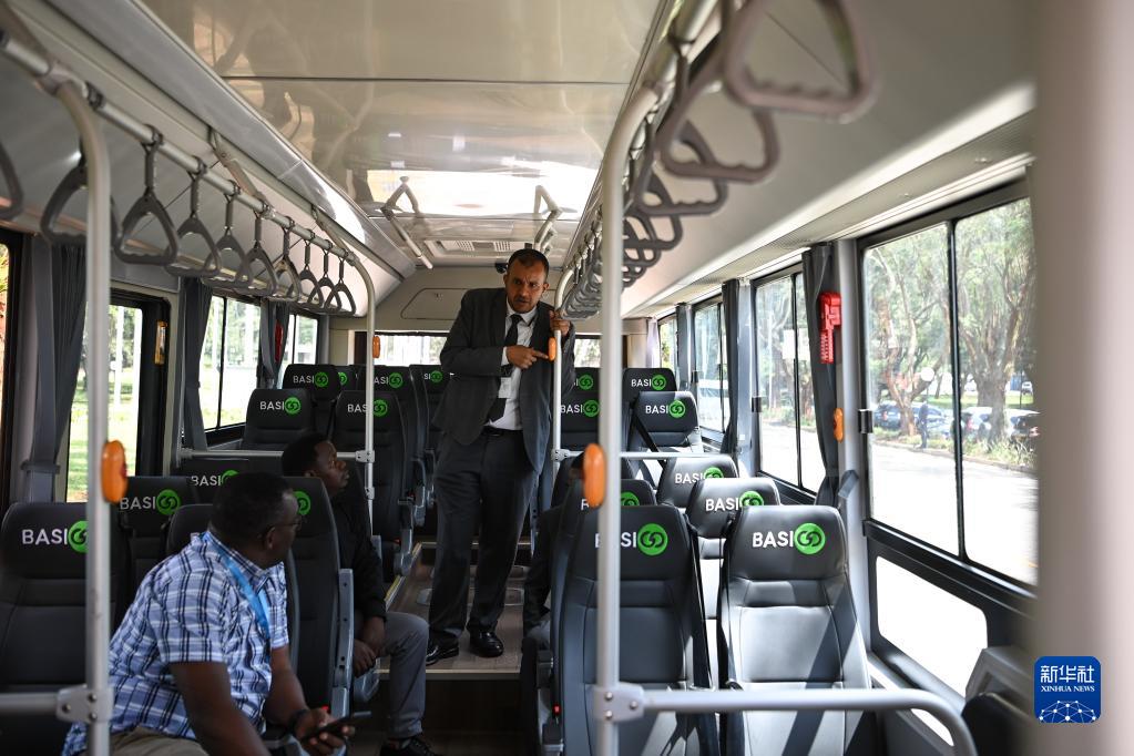 6月7日,在聯合國位于肯尼亞首都內羅畢的辦事處,人們在低碳和電動交通載具展上參觀電動公交車。