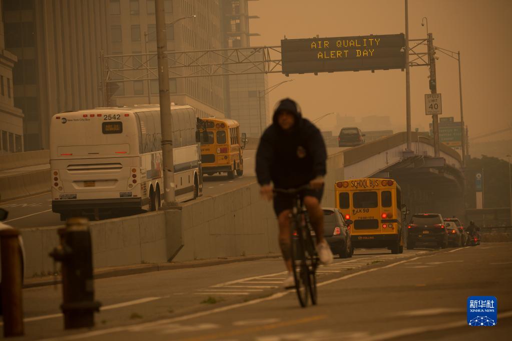 6月7日,一名市民騎自行車經過美國紐約一個空氣質量警報顯示牌。