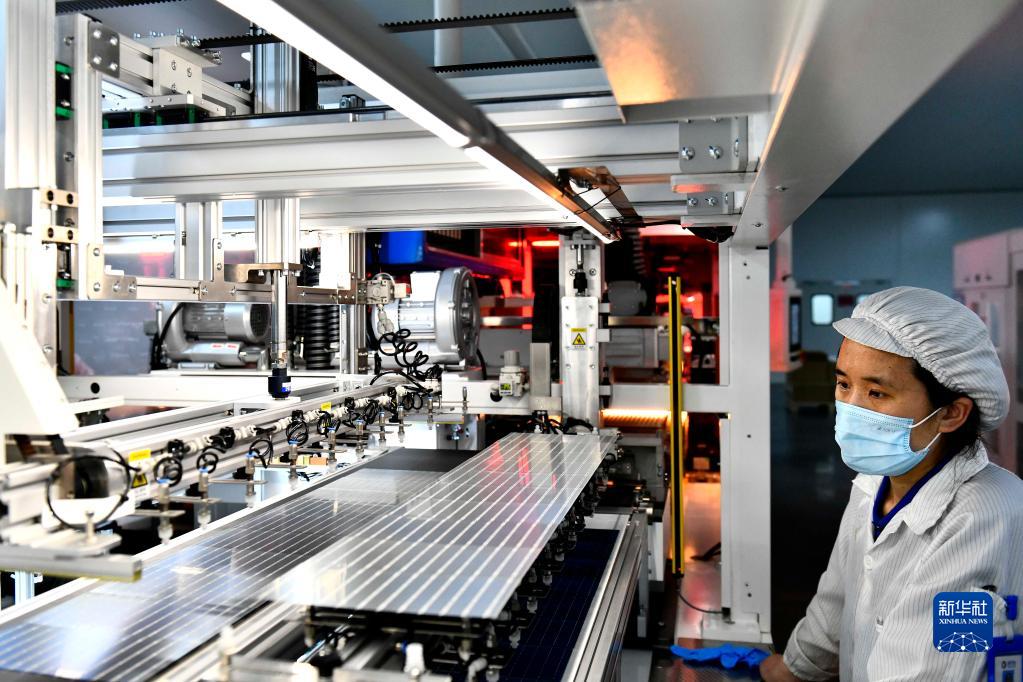 6月7日,在山東泉為新能源科技有限公司,工作人員在生產光伏組件。