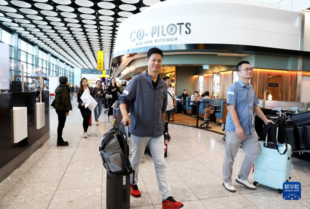 6月7日,搭乘中國南方航空CZ673首班航班的旅客抵達后走在英國倫敦希思羅機場內。