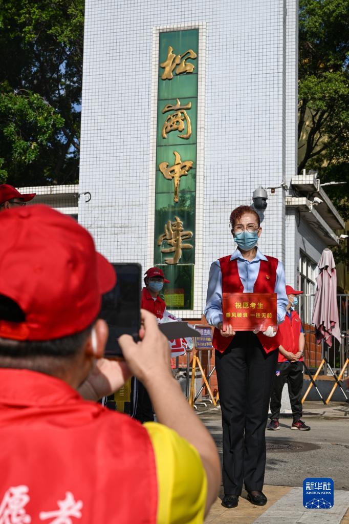 6月7日,高考第一天,段鳳麗將考生送到考場松崗中學后,在學校門口留影。