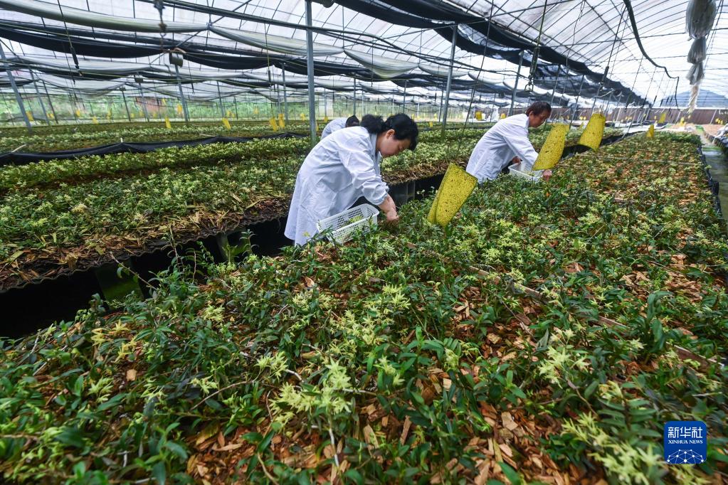 6月8日,種植戶在諸暨市東白湖鎮的鐵皮石斛有機種植基地采摘鐵皮石斛花和鐵皮石斛鮮條。該鐵皮石斛有機種植基地占地200多畝,是由回歸的鄉賢創辦,該基地除了產出鐵皮石斛鮮條、盆栽以及鐵皮石斛粉、鐵皮石斛酒等多種相關產品外,還作為當地鄉村旅游的特色景點吸引了上海、杭州、蘇州等省內外游客前來采購、游玩。