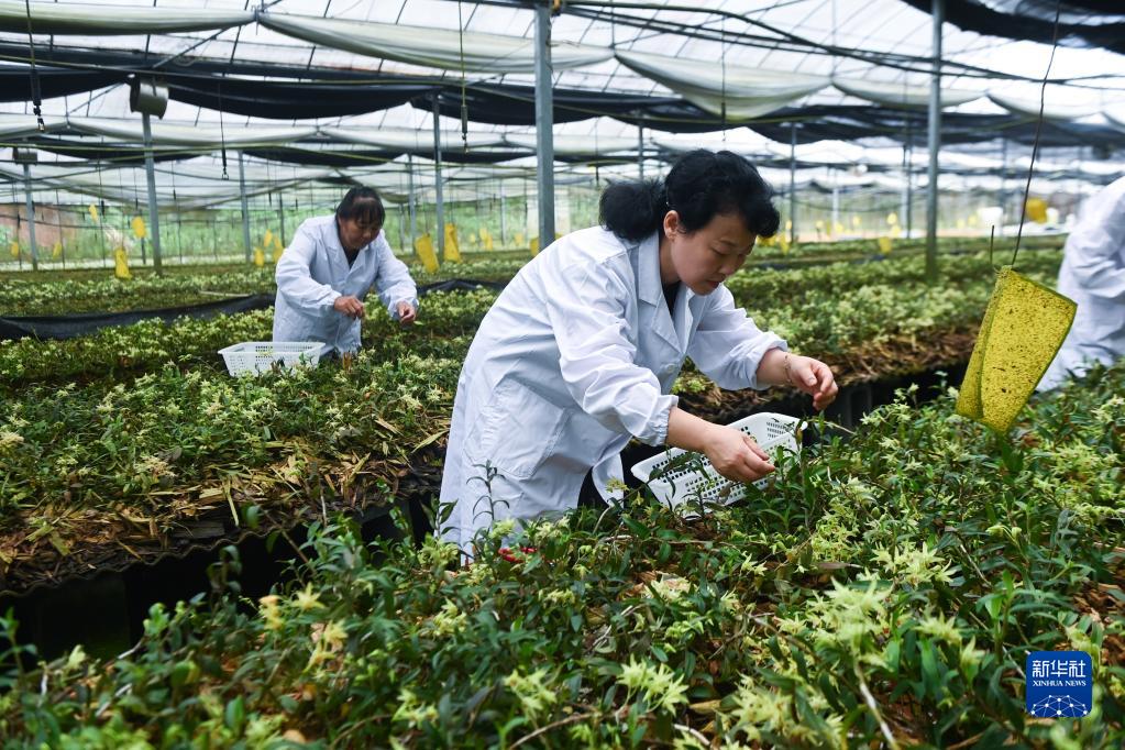 6月8日,種植戶在諸暨市東白湖鎮的鐵皮石斛有機種植基地采摘鐵皮石斛花和鐵皮石斛鮮條。