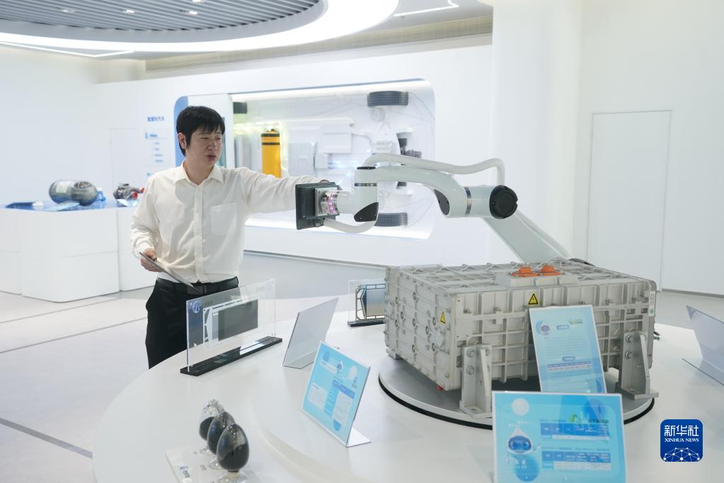 6月7日,在位于常熟的中歐氫能技術創新中心,工作人員在介紹氫燃料電池電堆。