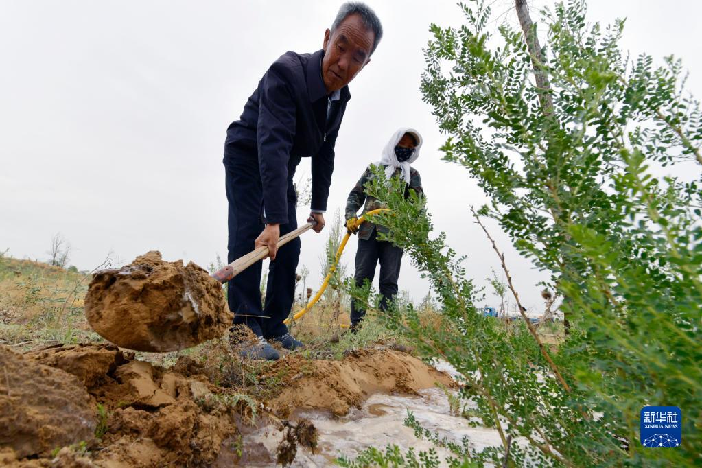 6月2日,八步沙林場場長郭萬剛在位于武威市古浪縣的一片林區管護樹苗。
