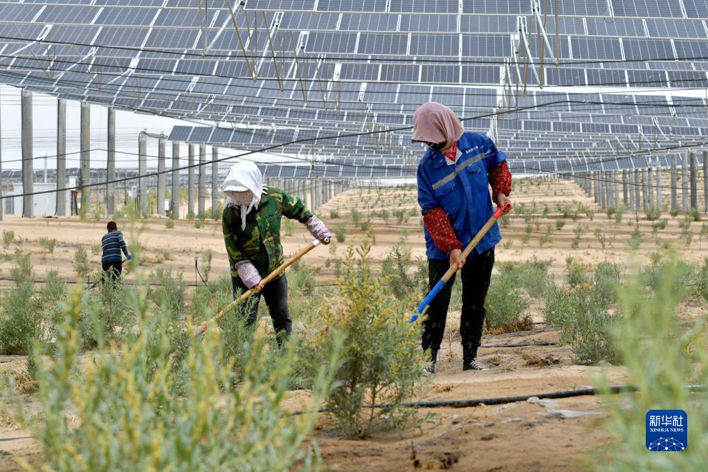 困難面前不低頭,敢把沙漠變綠洲。在八步沙“六老漢”奮斗精神鼓舞下,一代代勤勞樸實的人們奮戰在防沙治沙“接力賽”上??蒲腥藛T以沙為友,科學治沙讓沙化土地防治的可持續性顯著增強。板上發電、板下種植、板間養殖、治沙改土的模式,使光伏產業與生態治理深度融合。人們從光伏治沙等沙產業中獲益,沙漠經濟效益反哺荒漠化防治循環發展。