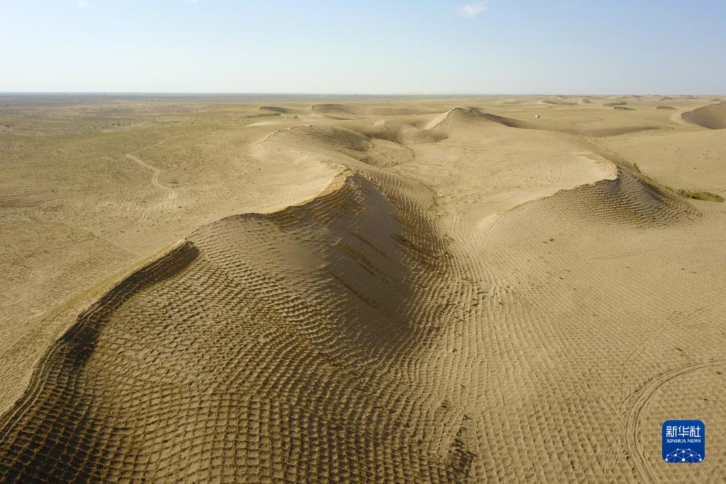 這是5月31日在武威市民勤縣沙咀墩機械壓沙示范區拍攝的草方格沙障(無人機照片)。