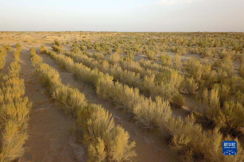 這是5月31日在武威市民勤縣薛百鎮拍攝的人工梭梭林(無人機照片)。