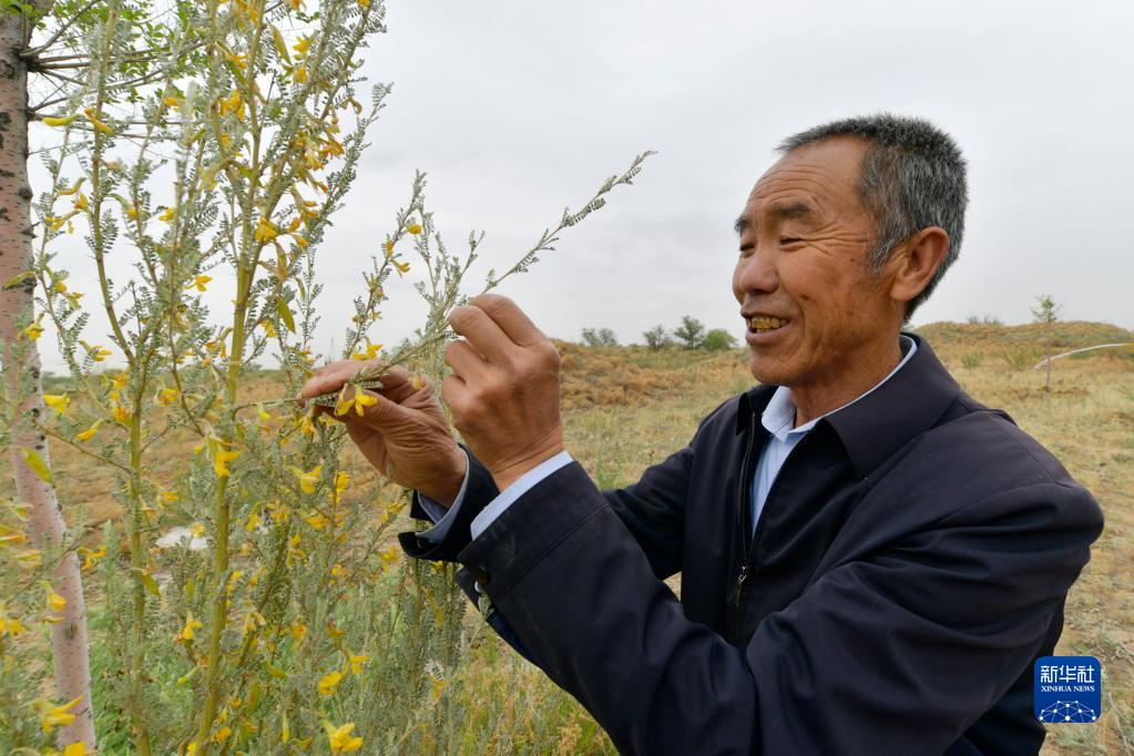 6月2日,在位于武威市古浪縣的一片林區,八步沙林場場長郭萬剛查看樹苗生長情況。