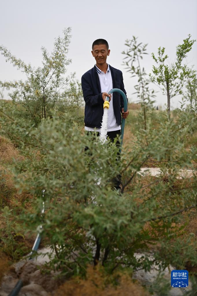 6月2日,八步沙第三代治沙人郭璽在武威市古浪縣的一片林區給樹澆水。