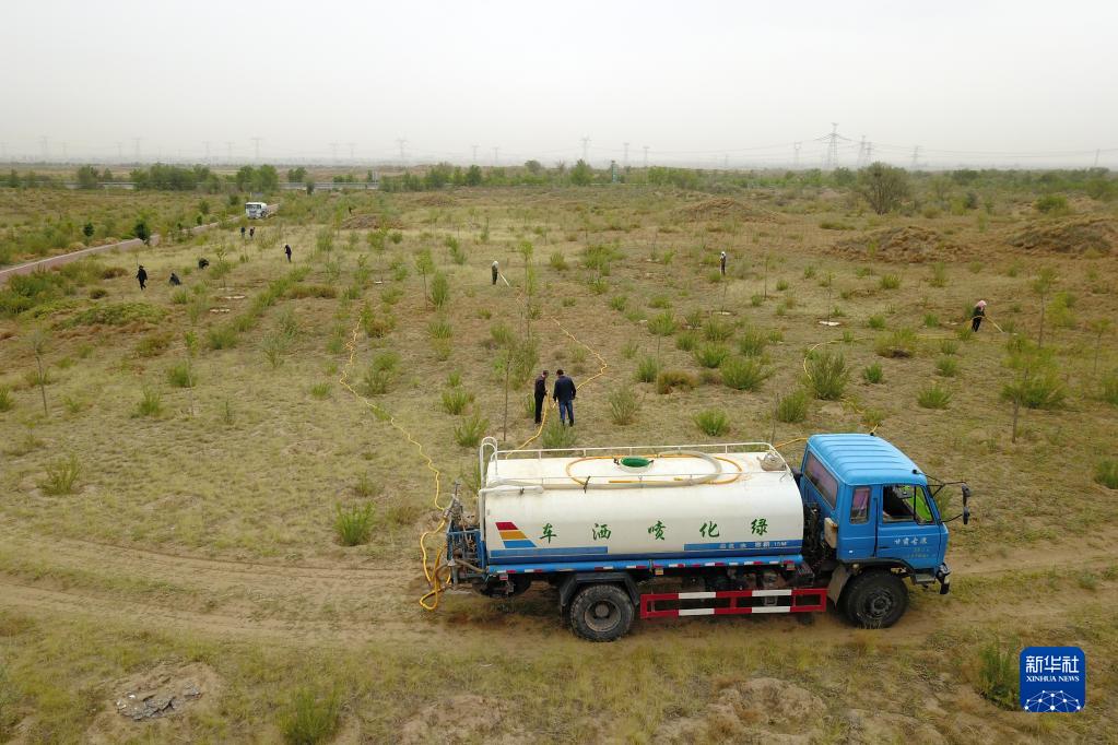 6月2日,在武威市古浪縣,八步沙林場職工給一片梭梭林澆水(無人機照片)。