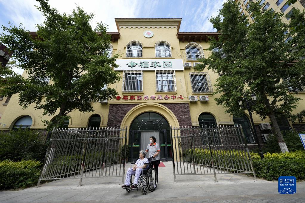 6月8日,河北省灤州市灤城街道東南都會社區一家社區養老中心的工作人員帶領行動不便的老人在社區內休閑。